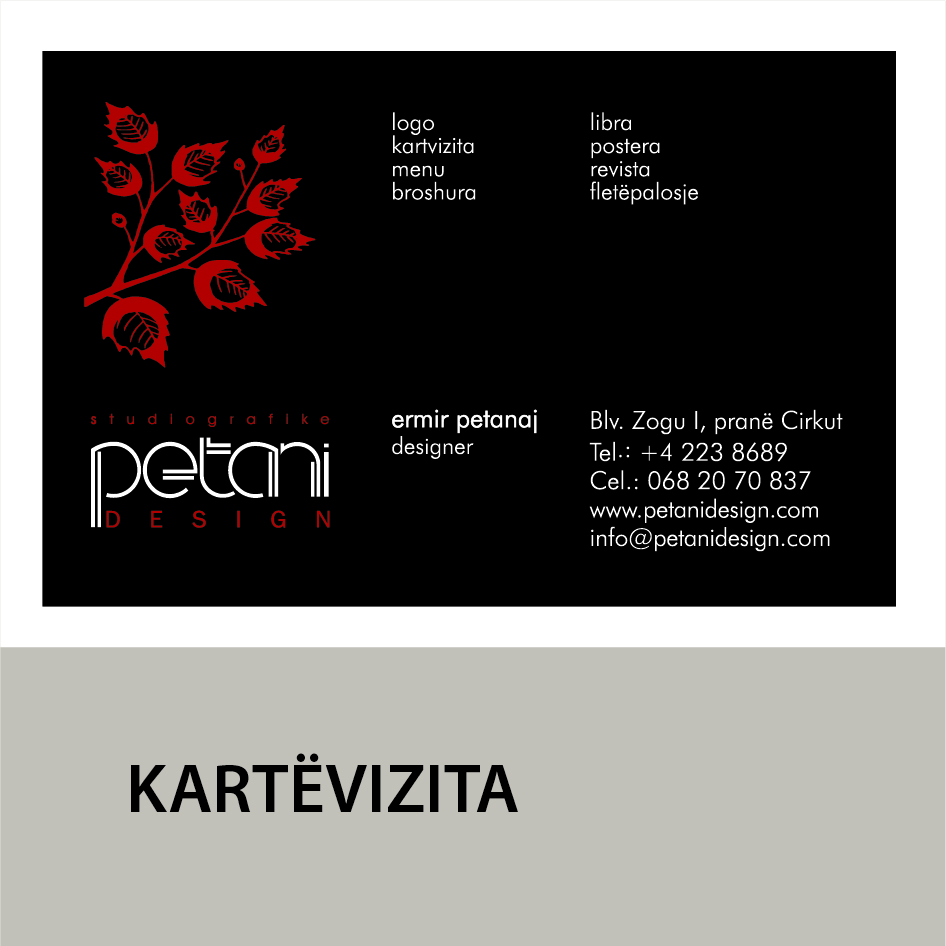 | KRIJIM I IDENTITETIT TË KOMPANIVE Logo Letër me kokë Kartëvizita Template për broshura dhe fletpalosje MATERIALE PROMOCIONALE: Stilolapsa Bluza Dosje Blloqe USB Çanta beze | KRIJIM DHE REALIZIM: Broshura Libra Kopertina Postera Kartëvizita Fletpalosje dhe volante Ftesa Revista Reklama 2D PRINTIME Leter format A4, A3, A2, A0 Baner dhe adesiv të formateve të ndryshme |